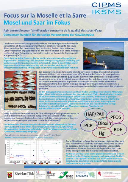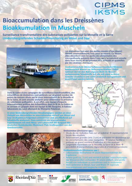 Du 4 au 11 mai 2023, le bateau-laboratoire Max Prüss de l’Office de la nature, de l’environnement et de la protection des consommateurs du Land de Rhénanie-du-Nord-Westphalie a effectué des prélèvements de dreissènes dans les eaux de la Moselle (depuis sa confluence avec le Rhin à Coblence jusqu’à celle de la Meurthe à l’aval de Nancy) et de la Sarre au niveau de sa confluence. Véritables bioindicateurs de l’état des eaux, ces moules zébrées d’eau douce permettront de fournir des informations sur d'éventuels polluants présents dans les cours d’eau, notamment sur la famille des HPA (hydrocarbures polycycliques aromatiques) classés comme cancérigènes. Les résultats de ces analyses feront l’objet d’une évaluation commune transfrontalière puis seront rendus publics dès qu’ils auront été validés.