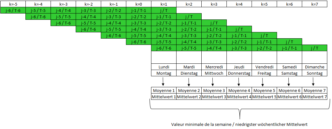 Le suivi de l’étiage au sein des CIPMS se fait sur la base du VCN7 hebdomadaire qui correspond à la plus faible des moyennes arithmétiques calculées sur les 7 jours consécutifs de la semaine écoulée (voir figure n°1). Cette période de 7 jours permet de lisser les fluctuations ponctuelles et hebdomadaires des débits sur les cours d’eau (ouverture ou fermeture de vannes de barrage, rejets, …) qui sont notamment observées sur les petits cours d'eau.