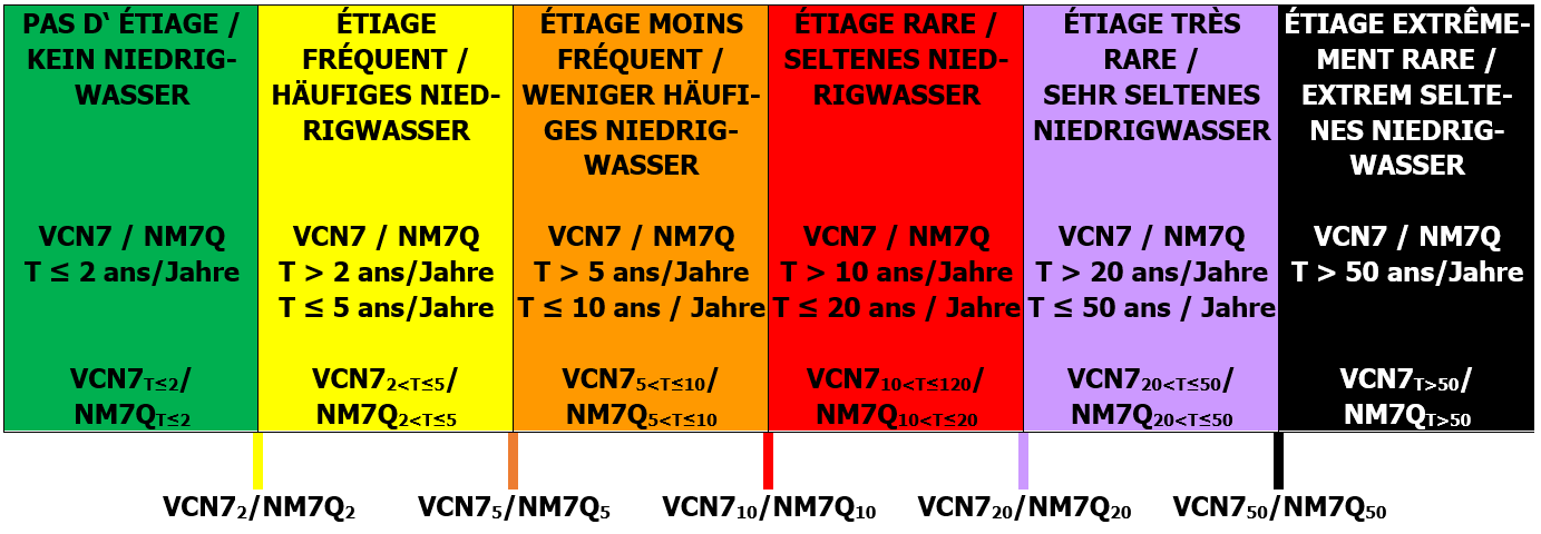 Ces valeurs seuils sont basées sur des séries chronologiques du VCN7 annuel allant jusqu'à l'année 2014. Certaines de ces séries chronologiques remontent à l'année 1953 (figure 3, tableau 1). Font exception, les quatre stations de l'administration fédérale allemande des eaux et de la navigation (Wasserstraßen- und Schifffahrtsverwaltung (WSV)) de St. Arnual (Sarre), de Fremersdorf (Sarre), de Trèves (Moselle) et de Cochem (Moselle) dont la série chronologique remonte à 2017 et dans le cas des deux stations de la Moselle la série chronologique remonte 1931 voire à 1918. Les VCN7 annuels se produisent majoritairement en été, et sporadiquement également en hiver (p. ex. Rupt-sur-Moselle 1970, 1978).